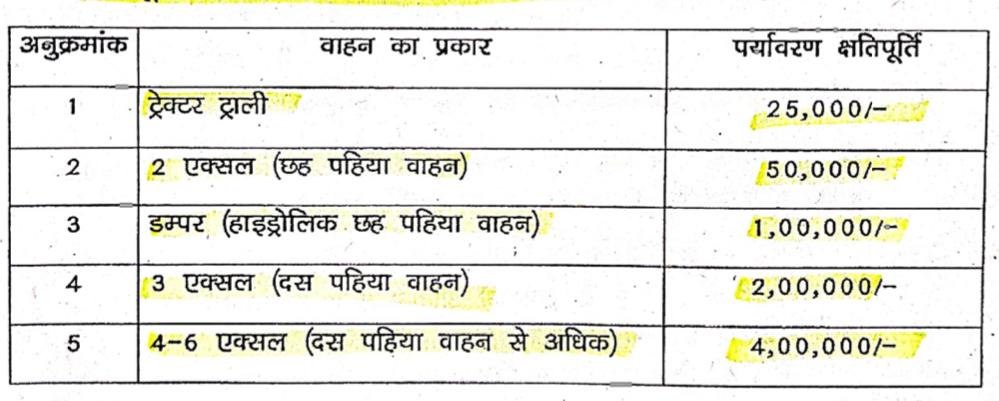 नवीन नियमों के अनुसार खनिज के अवैध उत्खनन अथवा खनिज या इसके उत्पाद के अवैध भण्डारण पर उल्लंघनकर्ता के उपर रॉयल्टी का पन्द्रह गुना अर्थदंड की राशि अधिरोपित की जायेगी,इसके साथ वाहन प्रकार के अनुसार पर्यावरण क्षतिपूर्ति की रकम अधिरोपित कर कुल जुर्माना किया जयेगा।अर्थदंड एवं पर्यावरण क्षतिपूर्ति की रकम कुल जुर्माना होगी।