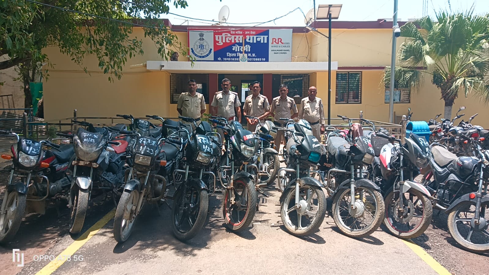 गोरमी थाना प्रभारी इंस्पेक्टर बृजेन्द्र सिंह सेंगर को 07 जून 23 को कचनाव रोड से सीटी हैंड्रेड मोटर सायकिल चोरी हुई थी उस गाड़ी से एक व्यक्ति जो 20 से 22 साल का है, मेहगाव से गुल्मी की तरफ आ रहा है मुख्य मुखबिर की सूचना पर से महरौली बम्बा के बम्बा के पास पुलिस फोर्स की घेराबन्दी कर दी उक्त मोटर सायकिल चालक को रोका तथा गाडी चैक की तो वही गाडी थी जो दिनांक 06 जुलाई 23 को चोरी हुयी थी मौके पर मोटर सायकिल जप्त की तथा आरोपी को गिर0 किया बाद आरोपी से पूछताछ की तो उसने घटना में इस मोटर सायकिल को चोरी करने में अपने साथ अन्य साथी का नाम बताया तथा घटना में शामिल होना बताया बाद पूछताछ घटना में शामिल अन्य आरोपी की तलाश की मिला जिससे पूछताछ की तो उसने अपने पास की 3 मोटर सायकिल तथा अपने अन्य 5 साथियों का नाम बताया तथा उनके घर पर रखी मोटर सायकिल के सम्बन्ध मे जानकारी दी वरिष्ठ अधिकारी को अवगत कराकर मोटर सायकिल अन्य 04 व्यक्ति के घर में तलाश की। उक्त चारों व्यक्ति फरार हो गये लेकिन उनके घर से मोटर सायकिल अलग-अलग कम्पनी की बजाज, टीवीएस एवं होण्डा कम्पनी की कुल 19 मोटर सायकिल बरामद कर कार्यवाही की गयी जिनकी कुल कीमत 8 लाख रुपये है। बरामद की गयी मोटर सायकिलें भिण्ड, दतिया, ग्वालियर एवं इटावा, जालौन उoप्रo की होना पायी गयी है। आरोपियों से पूछताछ जारी है जिसमें और भी खुलासे की सम्भावना है